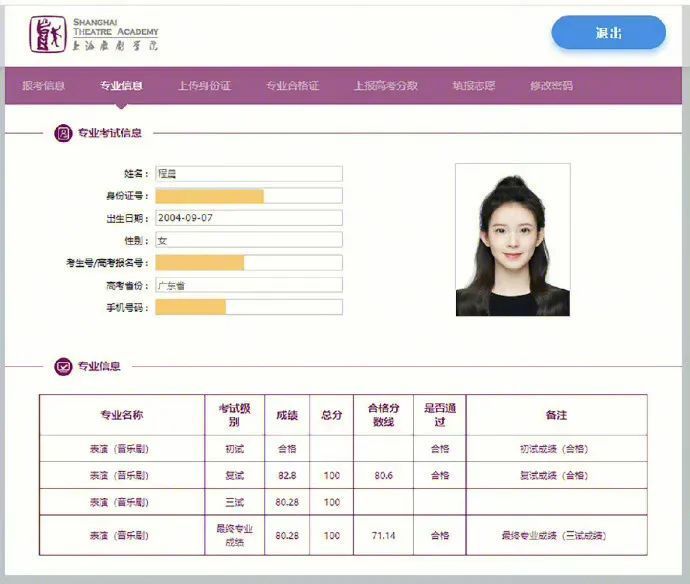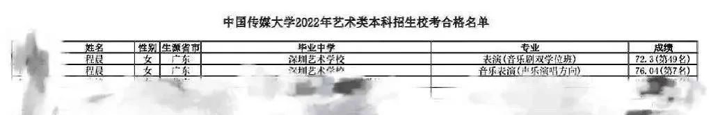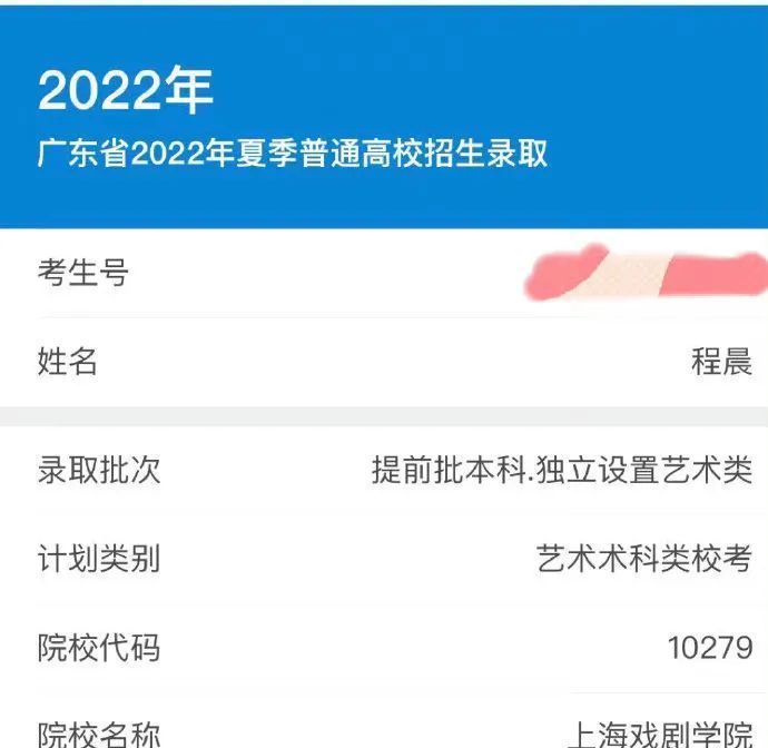 2022年,妹妹程晨被上戏中式,高考分数447分,告成被上戏音乐剧专科中式。