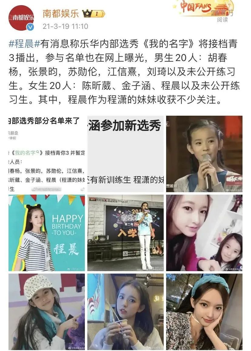 欧洲杯射手榜2021年,网上曾传出音信,程潇妹妹程晨将参加乐华里面选秀。