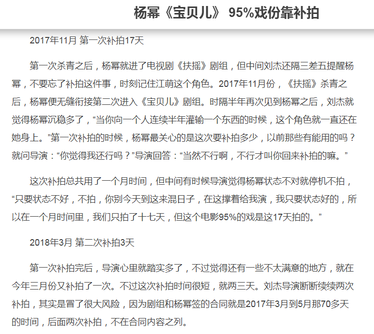 电影拍了70多天后终了,那时导演就知说念要补拍了,仅仅杨幂进组电视剧《扶摇》,刘杰只可隔三差五领导她补拍的事情,到了11月份《扶摇》终了,杨幂运行补拍《宝贝儿》,再次拍摄17天,拍结束电影95%的戏份。接着到了2018年3月份,又再次补拍3天,才算肃肃拍完。而刘杰也涌现,剧组和杨幂签的协议其实等于2017年3月到5月那70多天。