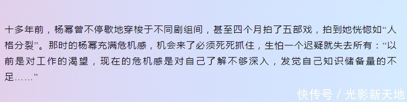先来说“4个月拍了5部戏”,这个话题来自杂志专访的一段骨子,写的是“十多年前,杨幂曾不休歇地穿梭于不同剧组间,致使四个月拍了五部戏,拍到她蒙眬如‘东说念主格辨认’。那时的杨幂充满危急感,契机来了必须狠狠收拢,只怕一个瞻念望就失去总共。”杨幂前些年出演的基本皆是院线电影和电视剧,莫得哪个能在一个月之内拍完,是以等于承认轧戏。
