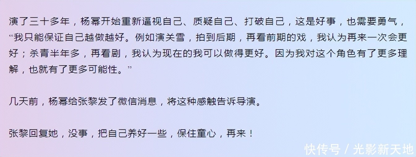 采访中杨幂我方说“我只可保证我方越作念越好。举例演关雪,拍到后期,再看前期的戏,我以为再来一次会更好;终了半年多再看剧,我以为当今的我不错作念得更好。因为我对这个扮装有了更多走漏,也就有了更多可能性。”为此杨幂还给张黎发了微信告诉她这种咨嗟。